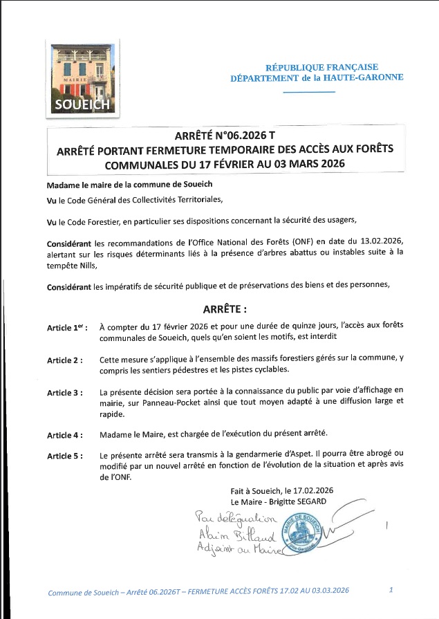 Par arrêté municipal n°06.2026 T, la mairie de Soueich annonce la fermeture temporaire des accès aux forêts communales pour une durée de quinze jours, du 17 février au 3 mars 2026.