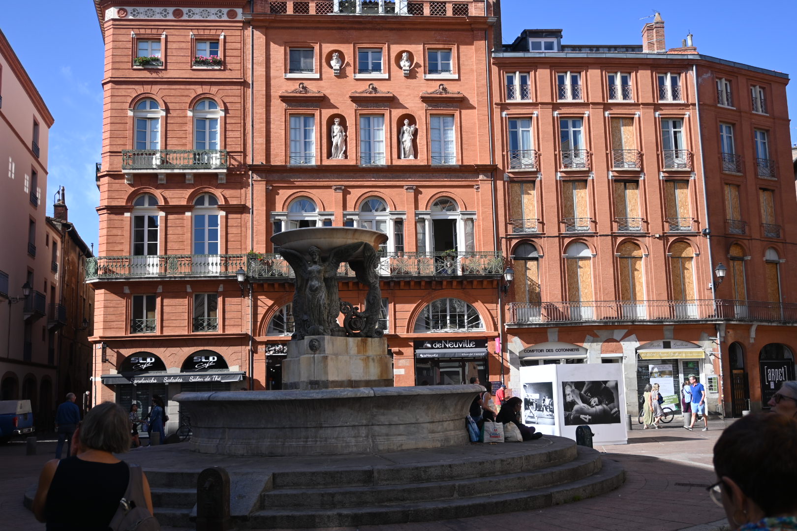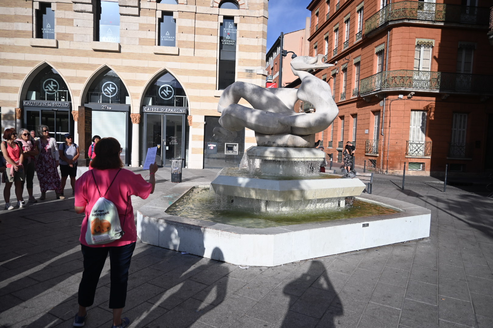 Par un temps magnifique, 2 h 30 pour 7 km environ dans Toulouse, en départ de la place d’Arménie et arrivée au quai de la Daurade. Nous avons pu voir de nombreuses cariatides qui ornent les bâtiments du centre-ville, de belles fontaines également ornées de femmes et la chapelle des Carmélites qui